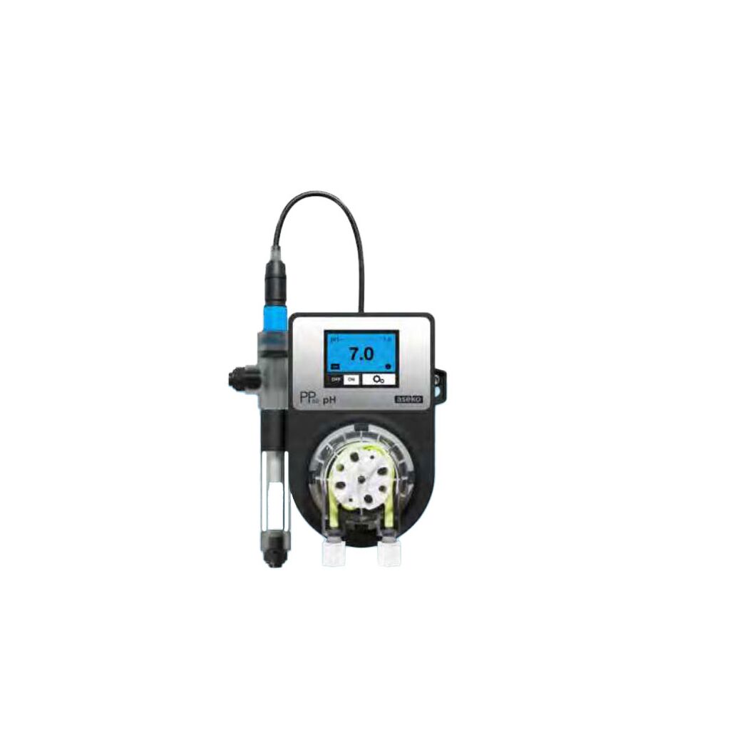 Kompakte ASEKO Einheit zur automatischen Messung und Regelung des pH-Wertes nach eingestelltem Sollwert mit LED-Display, Glassonde, integrierter Dosierpumpe (3,6 L/h), sowie 10 m Mess- und Dosierleitung, Messwasserabsperrhähne und Impfventil 1/4" AG, einfache Installation und Bedienung über 4 Tasten, zur Wandmontage, inklusive Sicherheitsabschaltung, für Pools und Whirlpools bis 250 m³, 230 V / 50 Hz, Schutzart IP30