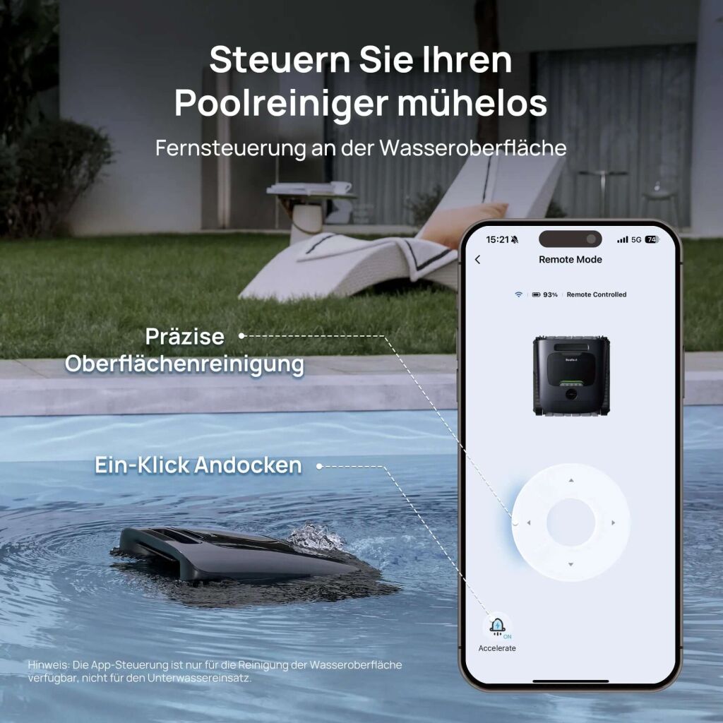 - Wasseroberflächen-Parken & Ein-Tasten-App-Rückkehr: kehrt automatisch zum Rand zurück und parkt an der Oberfläche; SmartDrain lässt Wasser automatisch ab – leichteres Herausheben.