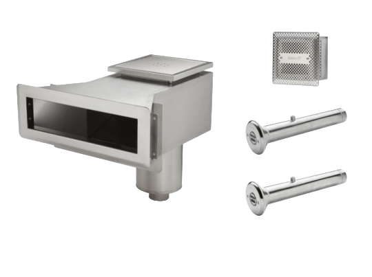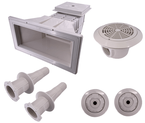 - Einbauteileset aus Kunststoff oder Edelstahl bestehend aus 1 x Skimmer, 1 x Bodenablauf, 2 x Mauerdurchführung, 2 x Einlaufdüse.